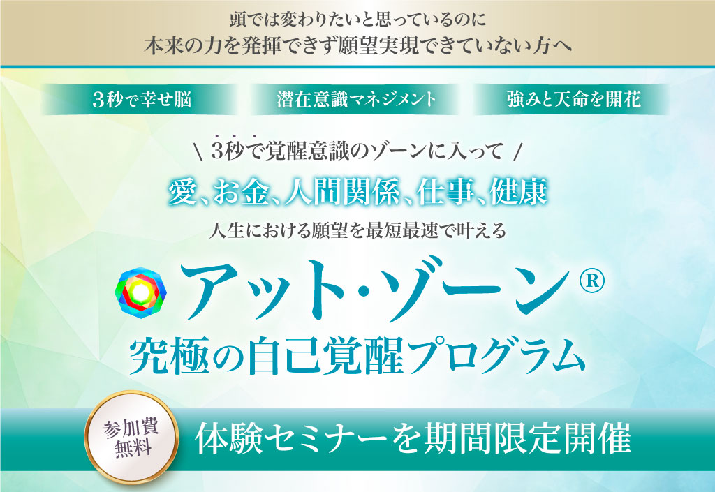 「3秒で幸せ脳になる潜在意識マネジメント術をマスターできるアットゾーン究極の自己覚醒プログラム体験セミナー」に招待させていただきます。